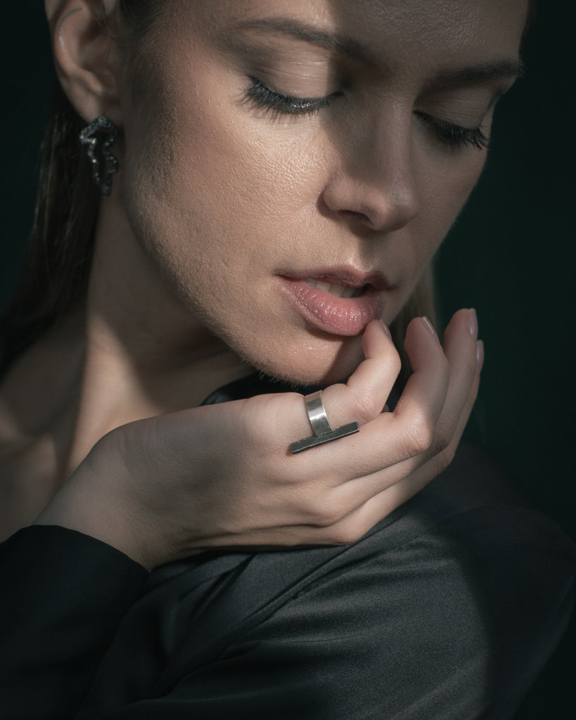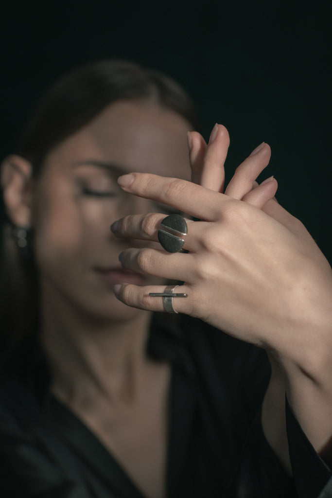 A minimalist sterling silver ring holding a slender vertical bar—simple, clean, and quietly bold. While it stands strong alone, it was designed to echo and enhance its companion: a second two thirds ring crowned with a split sea stone, together forming a subtle, magnetic unity.